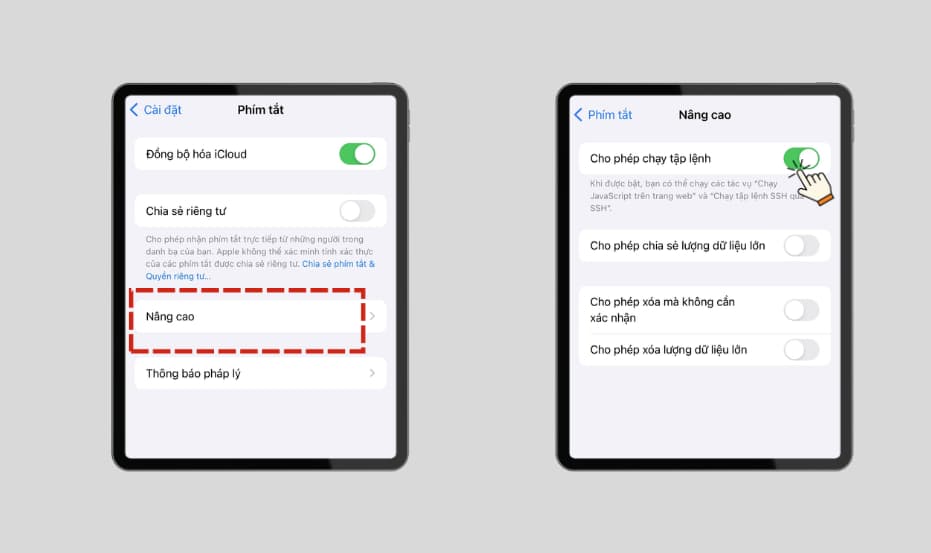 Bước 2: Chọn “Nâng cao” và gạt thanh ngang để bật cho phép chạy tập lệnh