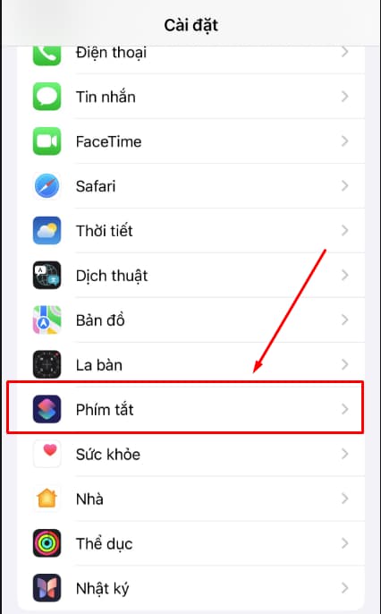 Bước 1: Vào “Cài đặt” trên điện thoại và chọn mục “Phím tắt”