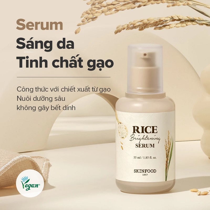 Serum sáng da làm từ gạo của Skinfood là sản phẩm chứa chiết xuất gạo cô đặc, cung cấp vitamin B và các khoáng chất quan trọng cho da. Sản phẩm này giúp làm sáng da, hỗ trợ làm đều màu da, đồng thời cấp ẩm, giúp làn da trở nên rạng rỡ hơn chỉ sau một thời gian ngắn sử dụng.