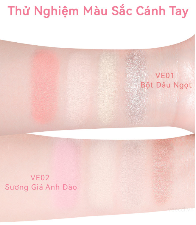 So với VE01, 02 sẽ có phần sáng hơn. Phấn má là tone hồng đào trong trẻo, nhũ sáng có hơi hồng cam (nhưng lên da không quá rõ), highlight và contour thiên về nâu sáng. Em này phải là da sáng thì mới dễ dùng được. Và vẫn như màu trên, nền da tối sẽ không quá hợp bảng này. Nếu bạn dùng makeup kiểu tự nhiên hàng ngày thì ok.