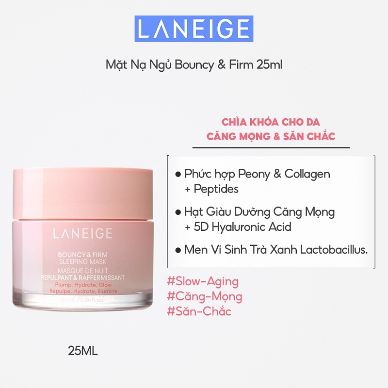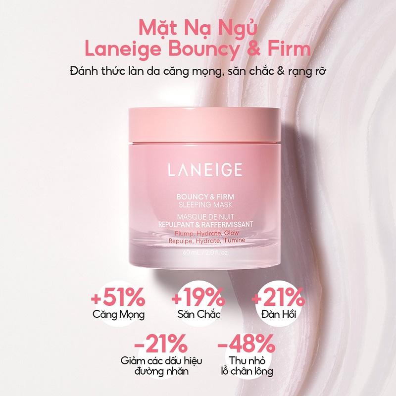 - Dưỡng ẩm sâu: Laneige Bouncy & Firm Sleeping Mask cung cấp độ ẩm dồi dào cho da, giúp da căng mọng và mịn màng suốt cả đêm.