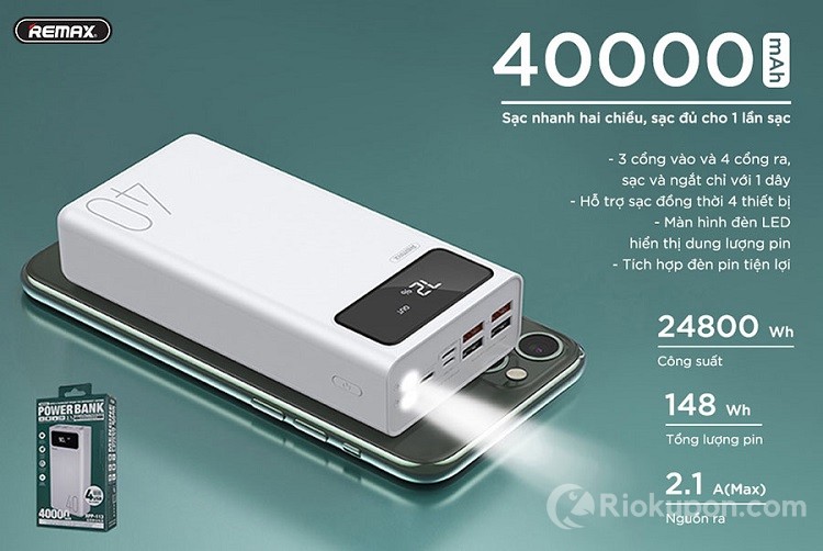 - Sạc dự phòng đến từ Remax có tốc độ sạc pin ổn định, nhiều dây cáp hỗ trợ thiết bị sạc nhanh. Ngoài ra, sản phẩm được tích hợp chip thông minh, không gây hại cho thiết bị của bạn.