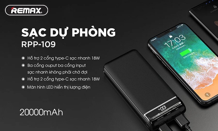 Sạc dự phòng Remax ra mắt rất nhiều mẫu sạc khác nhau với từng tính năng công nghệ tiên tiến. Đặc biệt phải kể đến là sạc dự phòng Remax RPP - 131 với ưu điểm sở hữu dung lượng pin lên đến 20000mAh có thể nạp đầy năng lượng có thiết bị của bạn từ 4 - 6 lần.