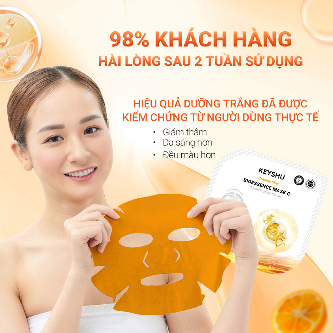 Bioessence Mask nằm trong BST dòng dưỡng trắng của KEYSHU. Em này có chứa công thức Vitamin C ổn định (3-O-Ethyl Ascorbic Acid) đem đến tác sáng da, cải thiện sắc tố. Thêm vào đó là Glutathione & Niacinamide giúp tăng khả năng chống oxy hóa, làm mờ thâm sạm, hỗ trợ phá vỡ gốc melanin – nguyên nhân chính khiến da xỉn màu.