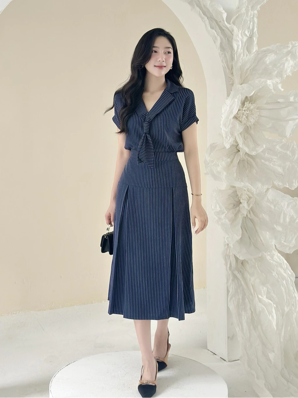 Set áo sơ mi cổ cavat phối chân váy xếp ly thiết kế U&M đi làm, đi chơi, đi tiệc