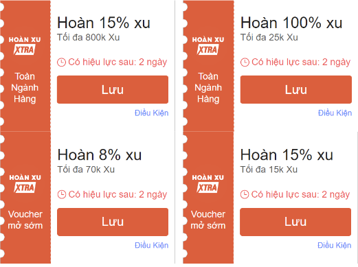 - Hoàn 15% xu tối đa 800k cho đơn tối thiểu 2 triệu