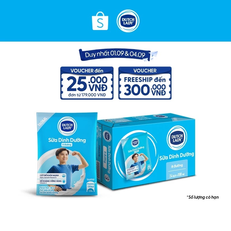 - Thùng 24 bịch sữa dinh dưỡng Dutch Lady ít đường 24x180ml