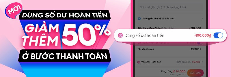 Bạn sẽ được giảm 50% (tối đa 100k) trên tổng giá trị đơn hàng. Mức giảm tối đa cho số dư hoàn tiền là không quá 500k/ngày và không quá 1,5 triệu/tháng.