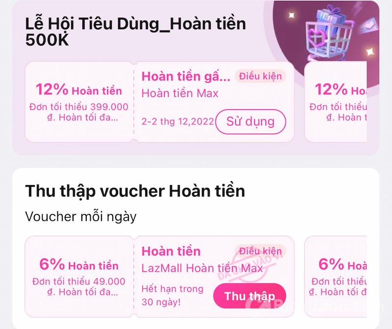 - Hoàn 12% tối đa 500k - Áp dụng trong các đợt khuyến mãi lớn như Lazada 11.11, Lazada 12.12.