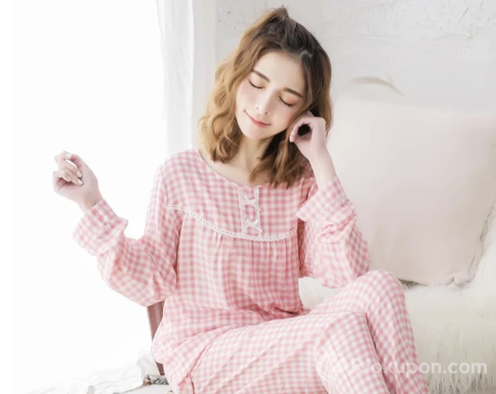Bộ đồ nữ mặc nhà áo dài tay, quần dài kẻ nhỏ