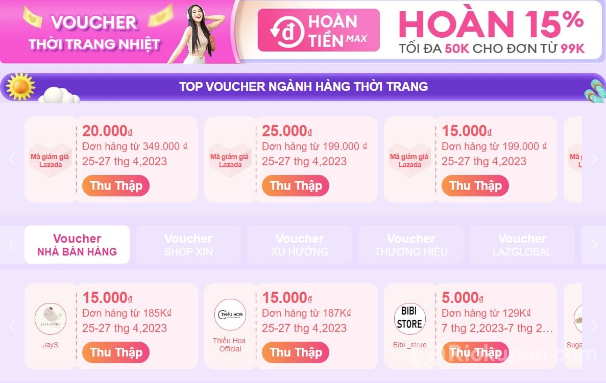 - Vào app Lazada thu thập các voucher từ voucher toàn sàn, voucher freeship max, voucher toàn tiền đến cả voucher gian hàng.