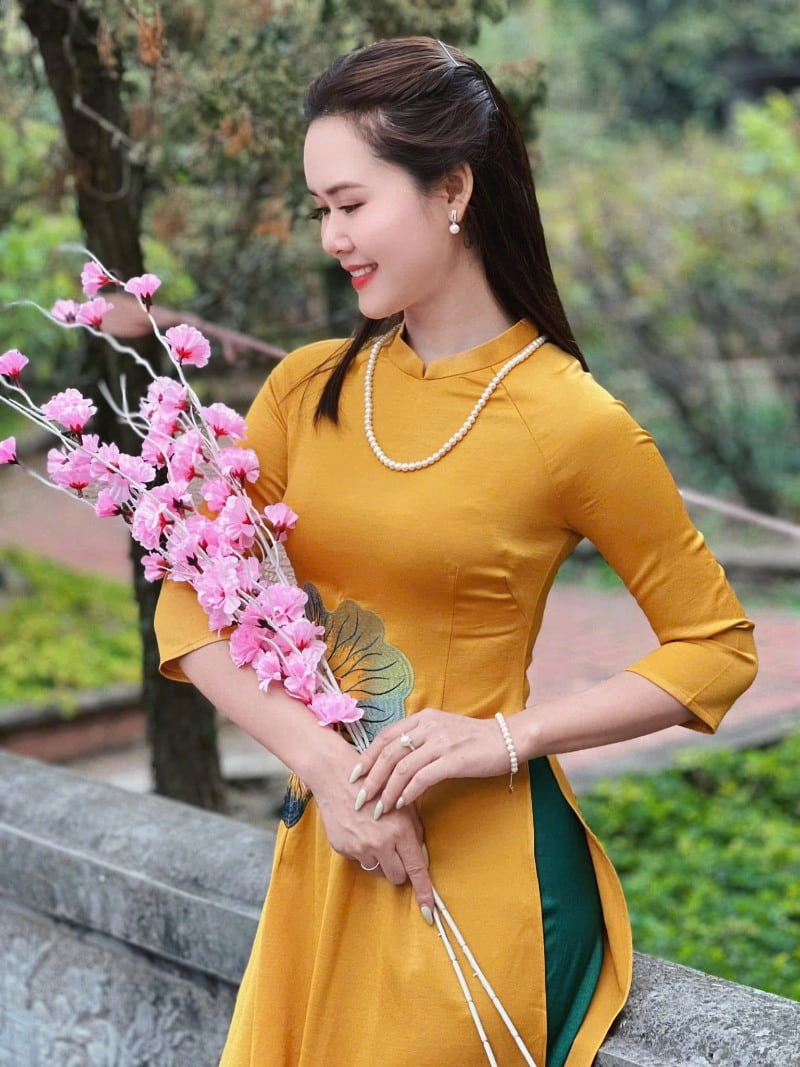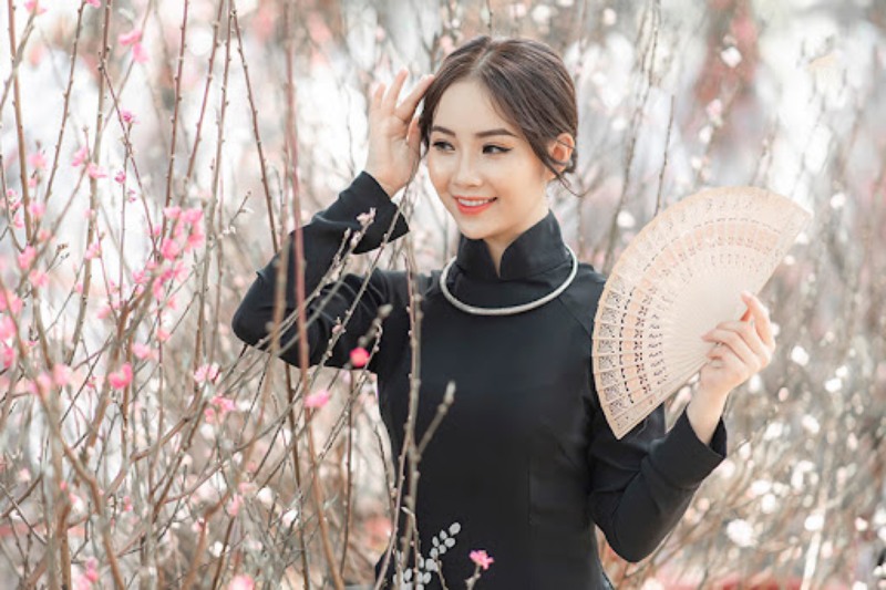 Quạt cầm tay không chỉ mang giá trị trang trí mà còn là điểm nhấn đậm chất truyền thống khi diện áo dài. Một chiếc quạt lụa, quạt giấy hoặc quạt in họa tiết hoa xuân sẽ giúp tổng thể trang phục thêm duyên dáng. Đây cũng là phụ kiện mặc áo dài Tết được nhiều chị em yêu thích khi chụp ảnh du xuân, tạo dáng nhẹ nhàng và đầy cuốn hút.