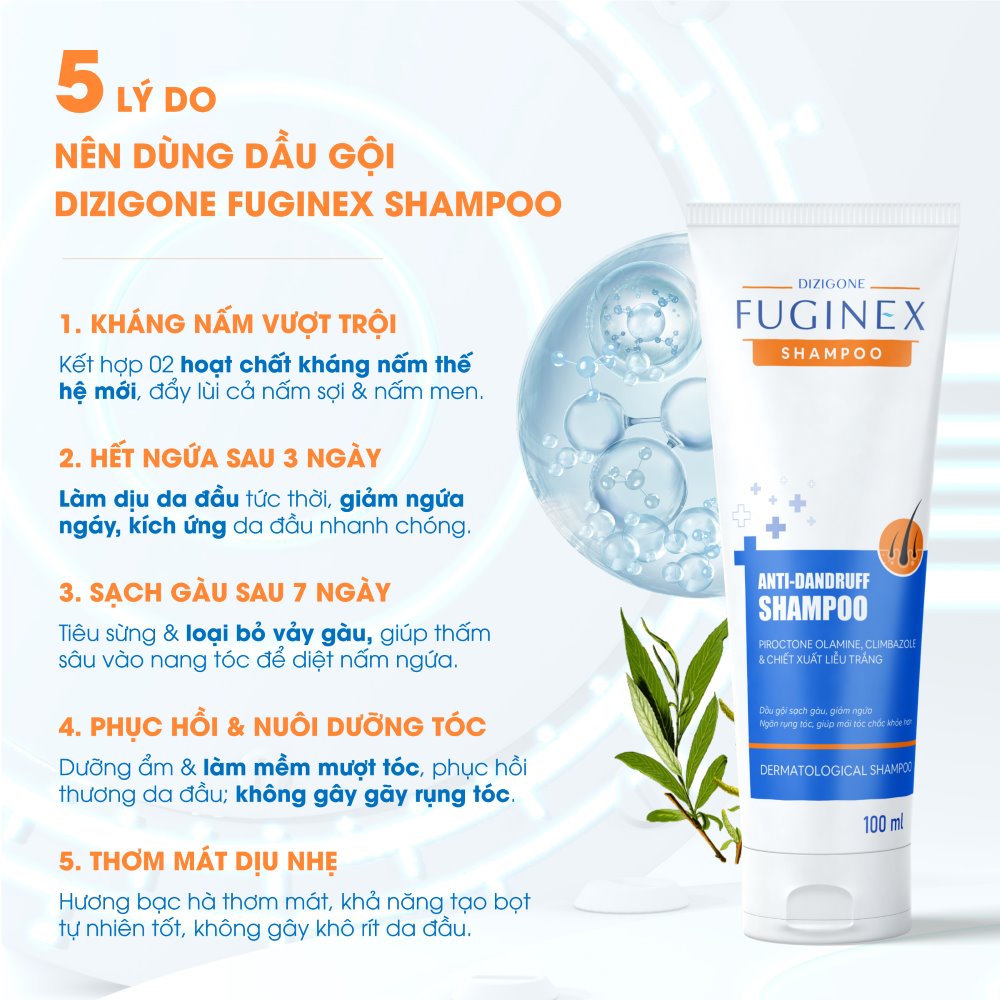 Dầu gội đặc trị cho tóc gàu Dizigone Fuginex Anti-Dandruff Shampoo - 100ml hiệu quả vượt trội trong việc làm sạch tóc nhờ tác động tẩy rửa, kháng khuẩn lành tính từ những thành phần chiết xuất từ Piroctone olamine & Climbazole, vỏ liễu trắng lên men, EPI-ON, Acid salicylic (BHA) và Panthenol & Allantoin.