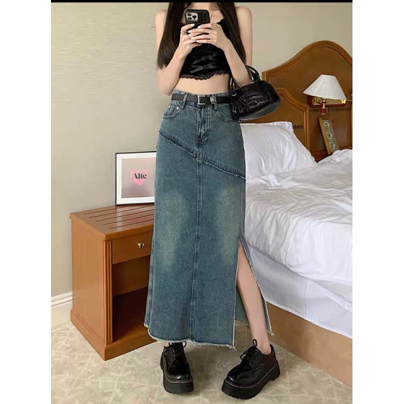 - Chân váy jean nữ xẻ dài qua gối lưng cao