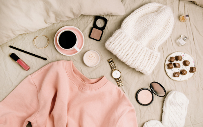 Khi chụp quần áo, bạn nên chọn thảm chụp ảnh mẫu có màu trung tính hoặc tương phản nhẹ để làm nổi bật màu vải. Trải quần áo phẳng, vuốt thẳng nếp để tránh nhăn. Có thể xếp theo kiểu dáng nguyên vẹn (như áo + quần phối cùng nhau), hoặc gập gọn một phần tạo điểm nhấn. Kết hợp thêm phụ kiện như kính, túi xách hay sách nhỏ đặt cạnh để khung hình sinh động hơn.