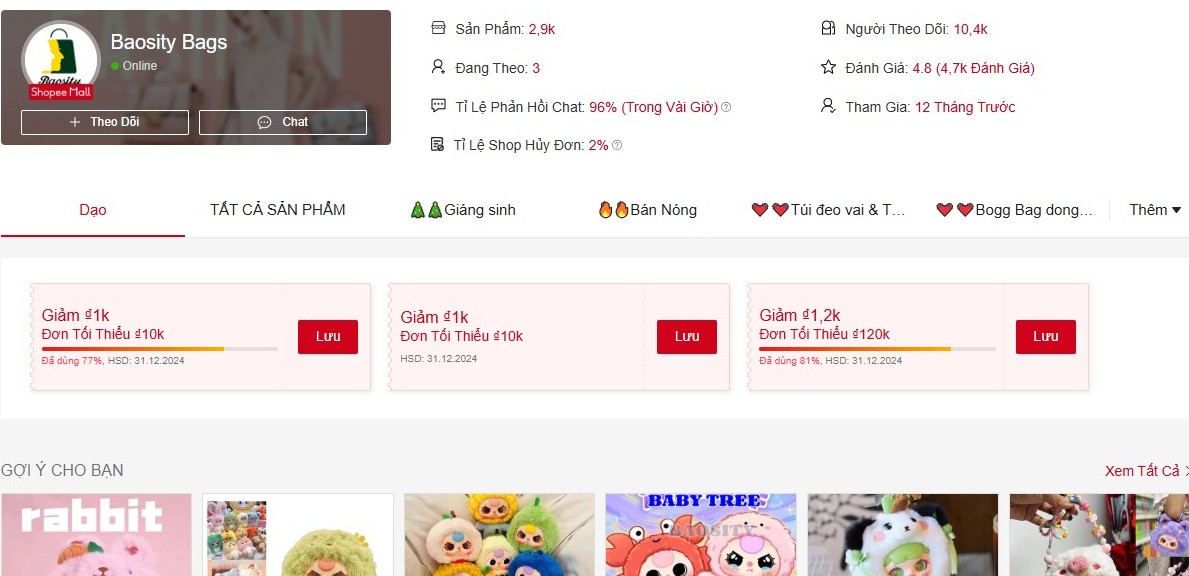 Mua Baby Three 12 con giáp uy tín trên Shopee bạn hãy chọn ngay Shop Baosity Bags. Mặc dù mới lên sàn Shopee 1 năm nhưng Shop đã có lượt Follow 10.4k, số lượng sản phẩm 2.9k và đánh giá 4.8* là 4.7k.