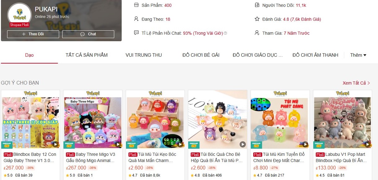 Gian hàng PUKAPI trên Shopee có 401 mặt hàng với đa dạng các dòng sản phẩm: đồ chơi bé giá, đồ chơi giáo dục, đồ chơi âm thanh, đồ chơi trí tuệ, đồ chơi vận động.