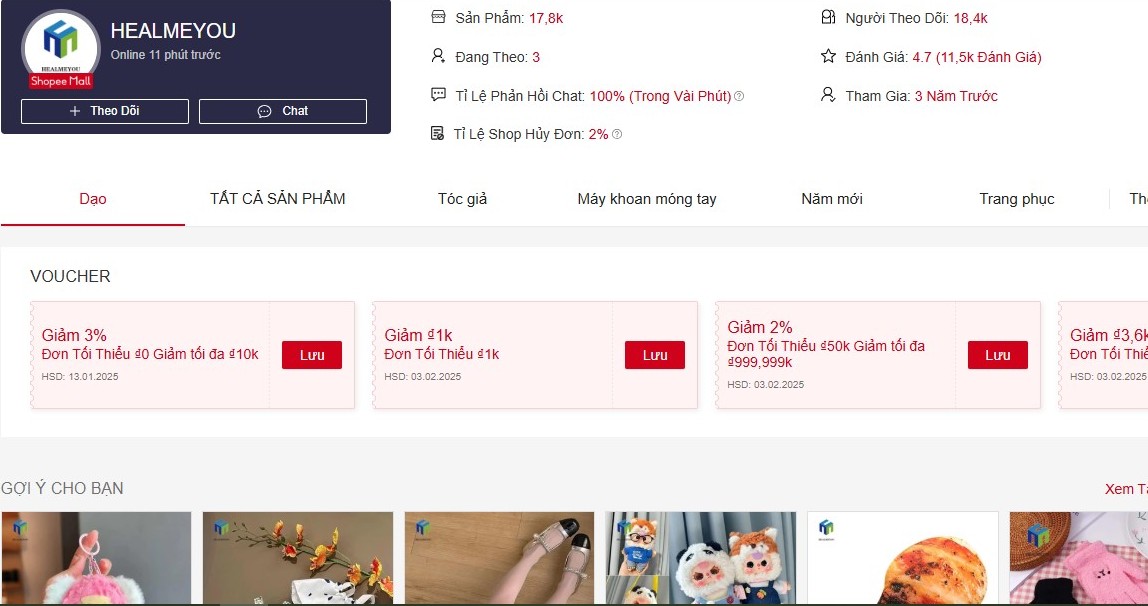 HEALMEYOU nằm trong top 5 Shop bán Baby Three 12 con giáp giá rẻ, uy tín trên Shopee. Có mặt trên sàn TMĐT Shopee 3 năm, Shop HEALMEYOU hiện có lượt theo dõi 18,3k, lượt đánh giá từ 4.7* 11,5k và số sản phẩm trong gian hàng là 17.8k với đủ các mặt hàng quần áo thời trang, phụ kiện và trang sức, đồ chơi...