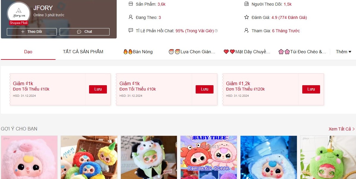 JFORY là địa điểm không thể tuyệt vời hơn dành cho các bạn đang tìm những Shop bán Baby Three 12 con giáp giá tốt nhất trên Shopee hiện nay. Gian hàng JFORY hiện có 3.6k mặt hàng với 774 đánh 4.9* và lượt Follow 1.5k chỉ sau 6 tháng gia nhập sàn.