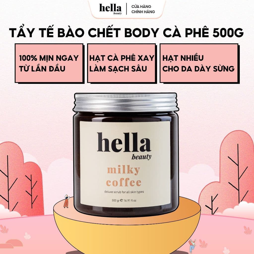 - Tẩy tế bào chết body, trắng da cà phê hữu cơ Hella Beauty 500g