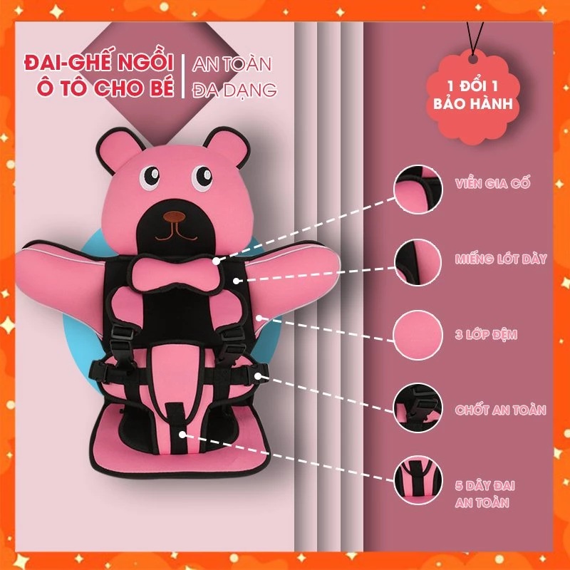 Với thiết kế hình gấu đáng yêu, mẫu ghế này khiến bé thích thú ngay từ lần sử dụng đầu tiên. Ngoài vẻ ngoài bắt mắt, sản phẩm còn sở hữu đai an toàn chắc chắn, giúp cố định bé trong tư thế an toàn khi xe di chuyển. Chất liệu mềm mại, không gây khó chịu cho da trẻ và rất dễ vệ sinh. Đây là lựa chọn hấp dẫn cho các bố mẹ muốn tìm ghế vừa đẹp vừa đảm bảo đúng công năng của một ghế an toàn cho trẻ em trên ô tô.
