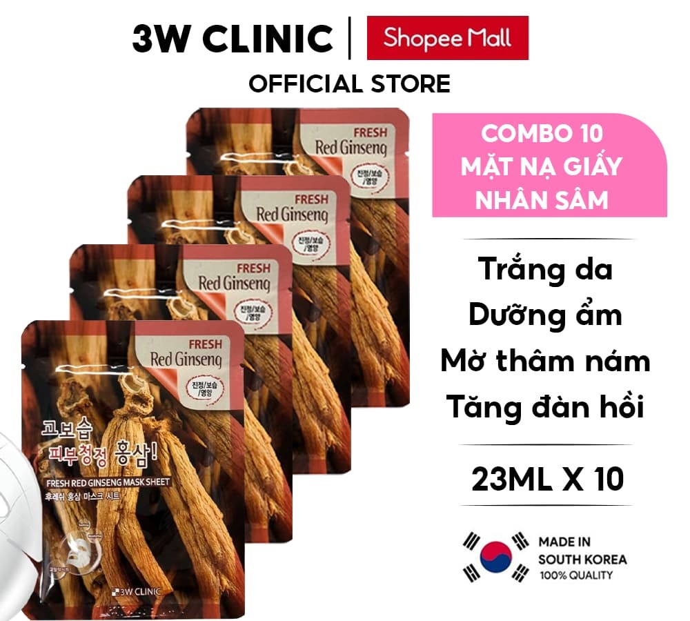 Mặt nạ dưỡng trắng da Hàn Quốc 3W Clinic với công thức đặc biệt kết hợp từ nhân sâm đỏ với tinh chất thảo dược từ thiên nhiên, giúp làm mềm và mịn da. Đồng thời, sản phẩm cung cấp độ ẩm và dưỡng chất nuôi dưỡng tế bào da non, tăng độ đàn hồi, chống nhăn, chống nám, sạm da, trả lại da căng bóng đầy sức sống.