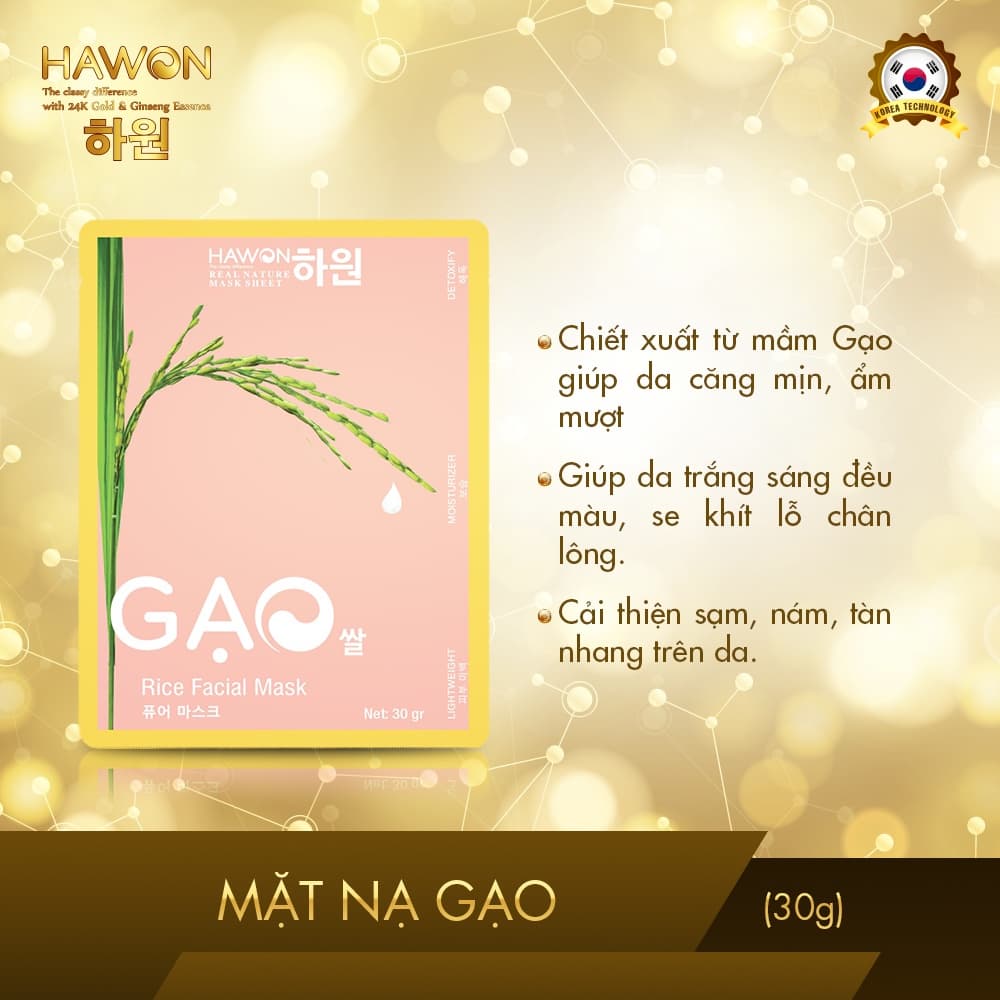 Mặt nạ dưỡng trắng da Hawon chiết xuất từ mầm gạo giúp da căng mịn, ẩm mượt. Mask giúp đẩy lùi tình trạng da khô ráp, sần sùi, làm da trắng sáng, đều màu và se khít lỗ chân lông. Bảng thành phần siêu lành tính, chủ yếu là từ thiên nhiên, thảo mộc nên bạn hoàn toàn có thể yên tâm khi dùng.