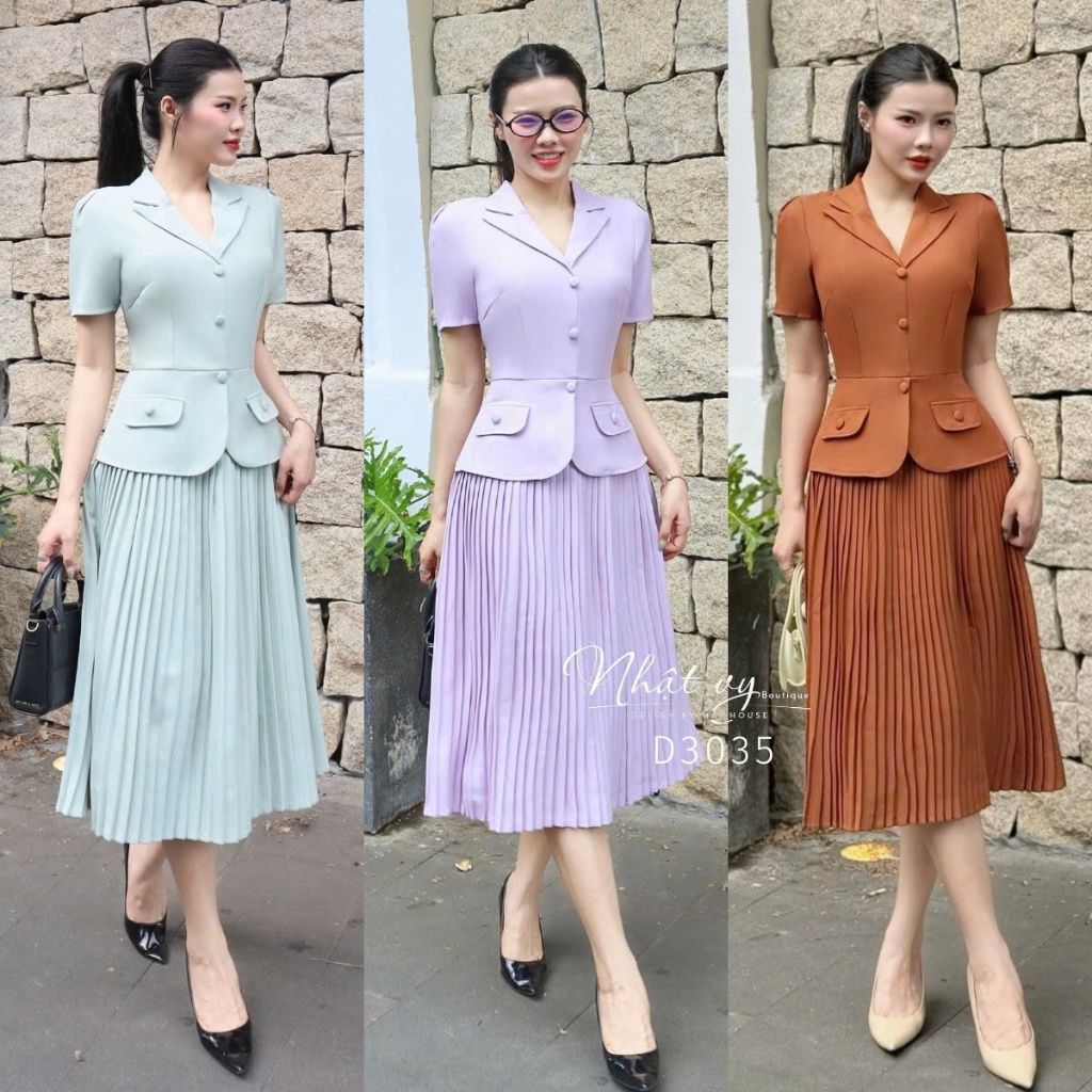 Phần chân váy xếp ly dáng xòe, chiều dài ngang bắp chân giúp tôn dáng cho chị em. Điểm nhấn là hàng cúc bọc, hai túi giả đính nút bọc, khóa kéo sau. Chất vải lụa mềm mát, có độ rủ nên tạo sự duyên dáng, thanh lịch cho người mặc. Chị em ngoài mặc váy D3035 đến công sở còn có thể mặc đi tiệc, đi chơi, đi cafe cùng bạn bè...
