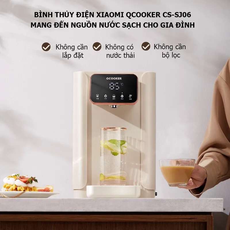 Xiaomi Qcooker CS-TJ04-75G là dòng máy lọc nước kiêm làm nóng khá hiện đại của nhà Xiaomi. Sản phẩm này vừa đóng vai trò là một chiếc máy lọc nước thông thường với công nghệ lọc RO 5 lớp siêu sạch, dung tích chức lên tới 4.2L đồng thời cho phép bạn có thể đun nước ấm/sôi để pha trà, sữa hoặc dùng cho các mục đích mà không cần đến ấm đun. Đặc biệt sản phẩm còn có bảng điều khiển điện tử giúp theo dõi nhiệt độ nước, dung tích nước khi cần nữa. Bình có kích thước 345x390x180mm, vỏ ngoài phủ màu rose gold nên bạn có thể thoải mái trang trí ở phòng khách nhỏ của gia đình.