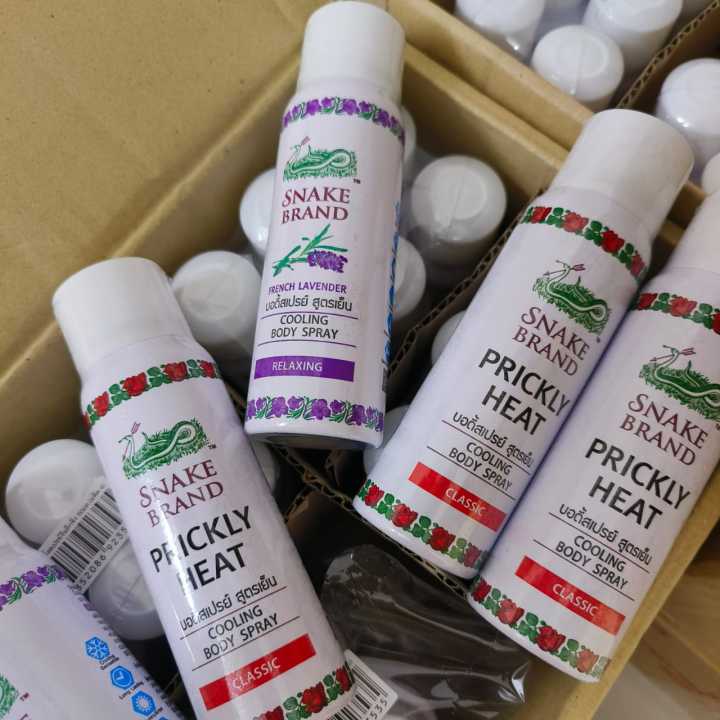 Snake Brand Prickly Heat Cooling Body Spray là dòng xịt lạnh của Thái. Sản phẩm có ưu điểm là làm lạnh nhanh bằng cách giảm nhiệt độ da 8 độ C trong 60 giây và mang lại hiệu quả làm mát dài tới 55 phút.