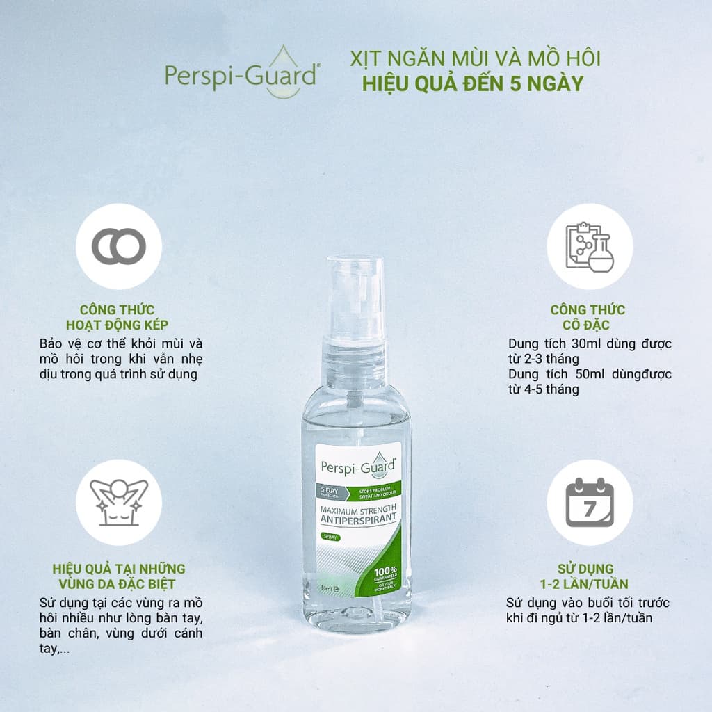 Xịt khử mùi cho nữ Perspi Guard là một giải pháp đặc biệt hiệu quả cho những ai gặp tình trạng đổ mồ hôi quá nhiều. Sản phẩm bảo vệ da hoàn toàn khỏi mùi mồ hôi khó chịu nhưng vẫn rất dịu nhẹ. Công thức của em nó đặc biệt hiệu quả, kéo dài lên đến 5 ngày chỉ với 1 - 2 lần sử dụng mỗi tuần. Bạn có thể sử dụng trên các khu vực thường hay tăng tiết mồ hôi quá nhiều như: dưới cánh tay, trên lòng bàn tay và lòng bàn chân...