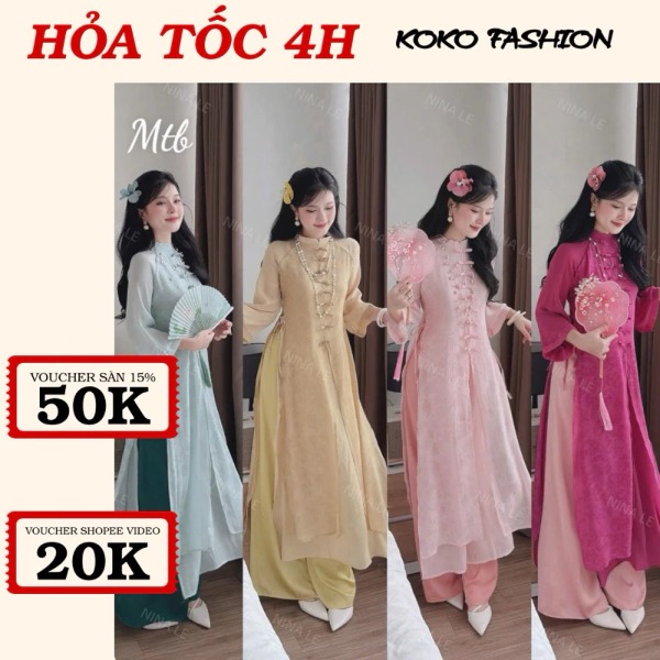 - Sét áo dài cách tân voan tơ hoạ tiết hoa cột nơ xẻ tà