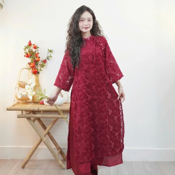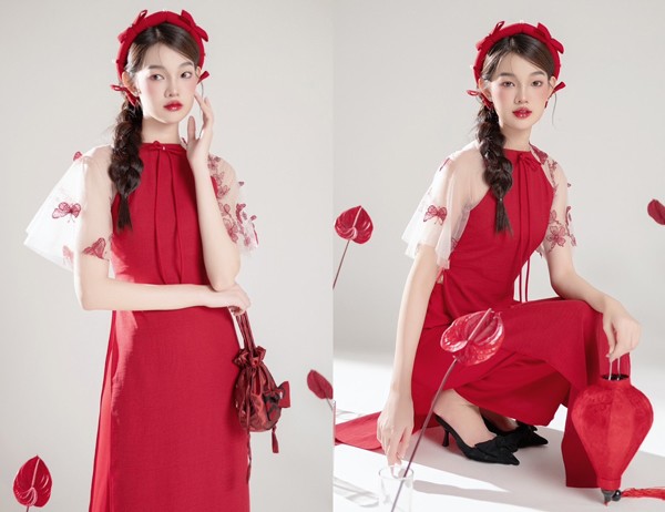 Nếu bạn yêu thích sự cầu kỳ, lộng lẫy hơn thì các thiết kế áo dài pha lớp với ren tinh xảo hoặc đính kết thủ công sẽ khiến bạn mê mẩn. Những chi tiết này không chỉ làm tăng độ sang trọng mà còn tạo điểm nhấn độc đáo, giúp chiếc áo dài trở thành tâm điểm tại những buổi gặp gỡ gia đình, chụp ảnh kỷ niệm hay các sự kiện đầu năm.