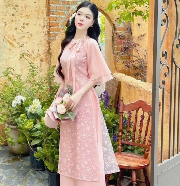 Chất voan tơ nhẹ nhàng kết hợp họa tiết hoa nhã nhặn tạo nên vẻ ngoài trẻ trung, bay bổng. Điểm nhấn cột nơ duyên dáng cùng chi tiết xẻ tà giúp thiết kế thêm phần hiện đại mà không mất đi nét truyền thống. Đây là lựa chọn phù hợp cho những buổi dạo phố, chụp ảnh đầu năm khi muốn diện áo dài Tết vừa xinh xắn vừa thoải mái.