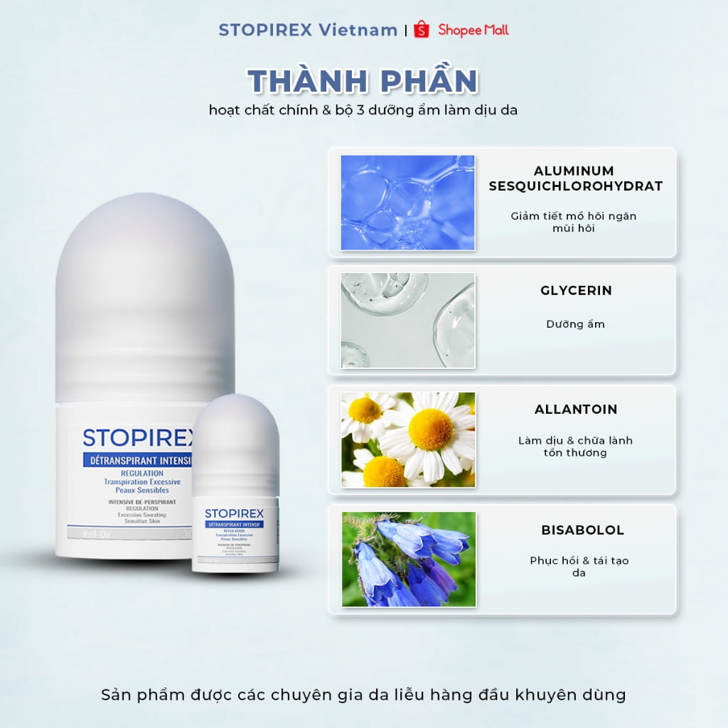 Lăn khử mùi Stopirex không làm thâm nách, không tạo vết ố vàng trên áo, không gây kích ứng, không có cảm giác châm chích. Không mùi nên chị em có thể sử dụng nước hoa, xịt thơm cơ thể. Thành phần gồm có:
