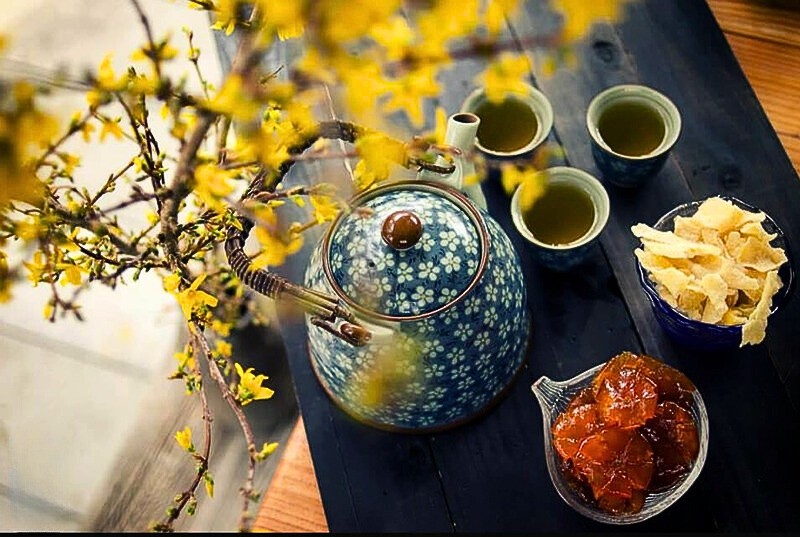 Bàn trà là nơi sum họp, trò chuyện và tiếp đãi khách trong những ngày đầu năm. Một khay mứt Tết, ấm trà gốm, vài chén sứ hoa văn cổ điển cùng bình hoa nhỏ sẽ giúp bàn trà trở nên ấm áp và trang nhã. Đây là góc trang trí thể hiện rõ nếp sinh hoạt Tết của người Việt, vừa gần gũi vừa mang nhiều giá trị tinh thần.