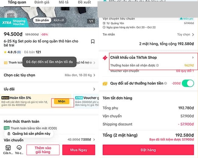 Bước 2: Khi bấm đặt hàng, Tiktok sẽ tự động áp voucher hoàn tiền cho bạn.
