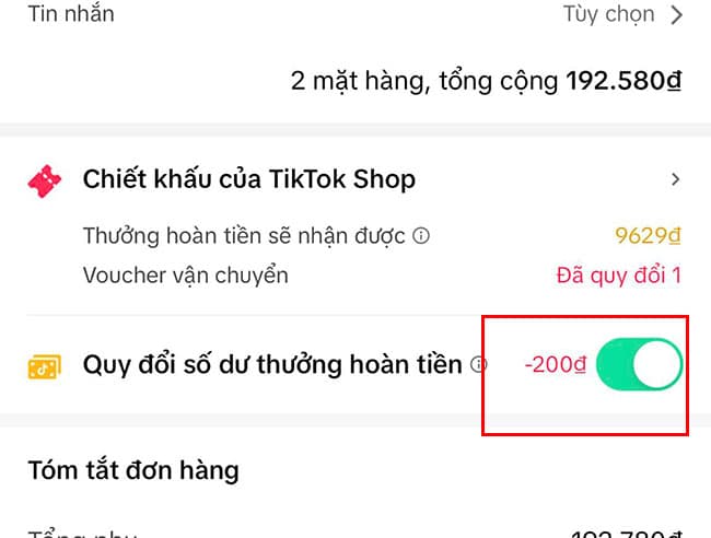 Bước 2: Tại mục thanh toán, bạn bật đổi số dư hoàn tiền, Tiktok sẽ trừ ngẫu nhiên số tiền cho đơn hàng của bạn.