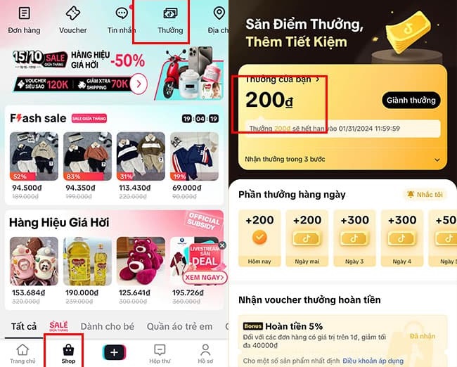 Bước 1: Truy cập vào Tiktok => Chọn Shop => Chọn mục Thưởng.