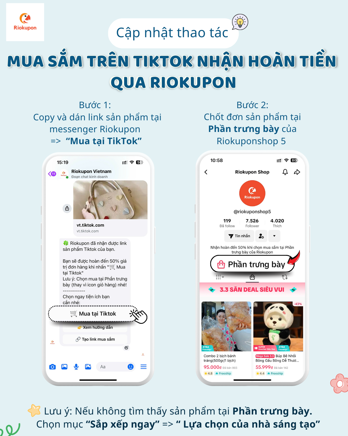 - Bạn chỉ được ghi nhận hoàn tiền khi chốt đơn ngay tại PHẦN TRƯNG BÀY tài khoản TikTok Shop “riokuponshop5”.