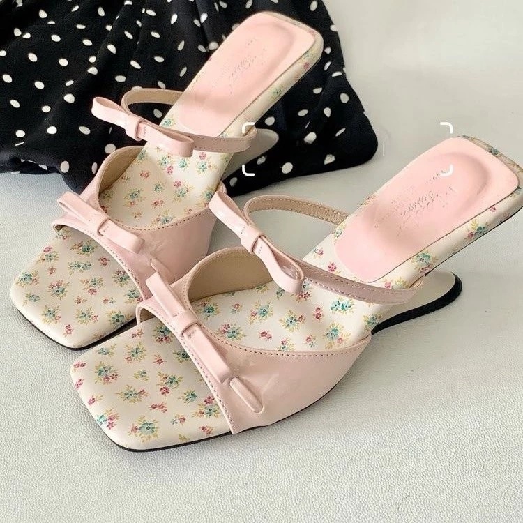 Guốc nữ cao gót mũi hở phối nơ phong cách đơn giản năng động màu đen cao