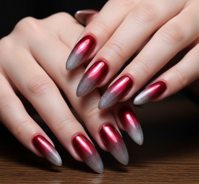 Móng dài luôn là lựa chọn hoàn hảo để phô diễn trọn vẹn vẻ đẹp của nail mắt mèo và tráng gương. Với dáng móng này, bạn có thể mạnh dạn chọn hiệu ứng mắt mèo vân rõ, tráng gương full móng hoặc kết hợp ombre chuyển sắc. Những gam màu như đỏ ruby, xanh ngọc lục bảo, tím mận hay bạc ánh kim sẽ giúp bộ móng trở nên nổi bật và mang ý nghĩa may mắn cho năm mới. Ngoài ra, việc kết hợp thêm charm nhỏ, đá li ti hoặc đường line ánh kim sẽ giúp tổng thể thêm phần sang trọng, rất phù hợp cho tiệc Tết, du xuân hay chụp ảnh đầu năm.