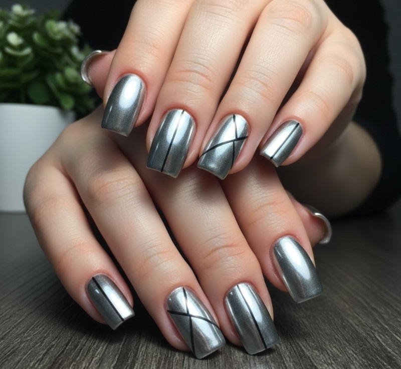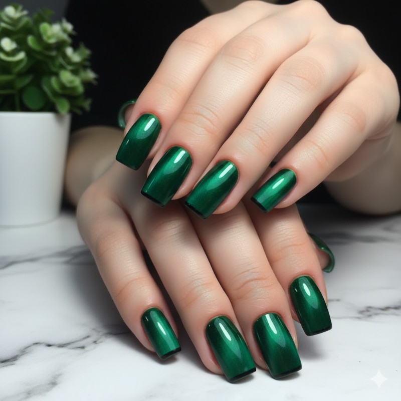 Nếu bạn yêu thích phong cách mạnh mẽ, thời thượng thì móng form vuông là lựa chọn không thể bỏ qua. Dáng móng này đặc biệt phù hợp với nail tráng gương sắc nét hoặc mắt mèo ánh thẳng, tạo cảm giác gọn gàng và hiện đại. Những gam màu như đen ánh bạc, xanh navy, nâu chocolate hay vàng kim sẽ giúp bộ móng nổi bật nhưng vẫn sang. Bạn có thể chọn tráng gương toàn bộ móng để tạo hiệu ứng bóng bẩy hoặc kết hợp mắt mèo cùng các đường line tối giản để tăng chiều sâu thiết kế. Đây là kiểu nail rất hợp với phong cách Tết hiện đại, cá tính nhưng vẫn giữ được sự tinh tế cần có.