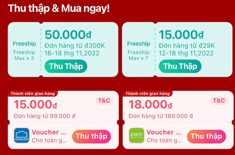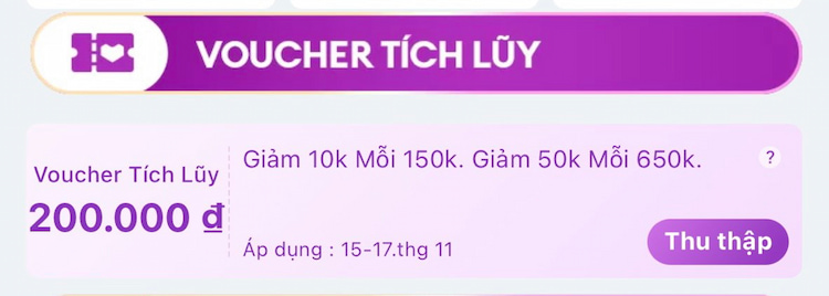 Voucher tích lũy: Đây là một dạng mã giảm giá mới, thường xuất hiện nhiều trong những đợt khuyến mãi lớn. Mã voucher này không giới hạn mức giảm tối đa. Bạn càng thu thập được nhiều mã, số tích lũy sẽ càng lớn thì mức giảm càng nhiều.