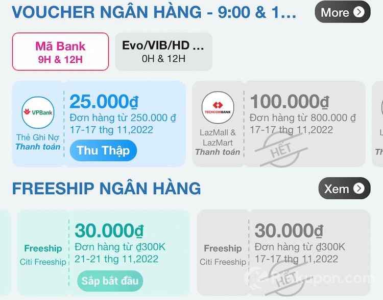 Mã giảm giá thanh toán đến từ các đối tác (ví điện tử, ngân hàng):: Đây là mã giảm được các đơn vị đối tác (thường là các ngân hàng hoặc ví điện tử) của Lazada phát hành. Ví dụ: ví Momo, eM, Zalopay,...